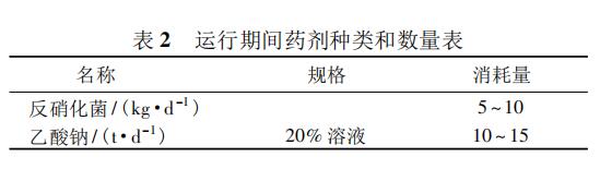 后置反硝化段调试过程中主要使用药剂包括反硝化菌、碳源(乙酸钠),具体投加比例及数量见表2。